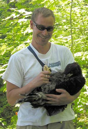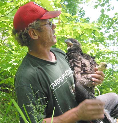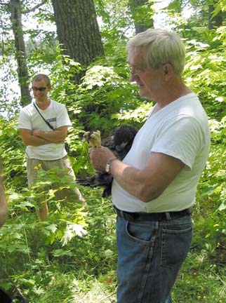On July 1st, Joe Papp came to Gratiot Lake to band one male eaglet. The baby was in good condition and the pike bones in the nest gave a clue of his good diet. An unhatched egg found in the nest and blood and feather samples taken from the eaglet will be analyzed to determine heavy metal, PCB, and pesticide content.