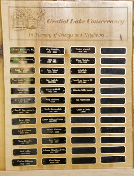 On August 15, Barb and John Noblet of Escanaba attended the GLC Open House at the Noblet Field Station. A memorial plaque including the names of many friends of GLC and Gratiot Lake residents was installed at the Field Station and dedicated that afternoon.
