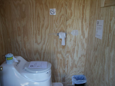 No running water, but a step up from the Conservancys privy, the new shed houses a composting toilet. The Sun-Mar Self-Composting Toilet is an example of an alternative to water flush toilets and a septic system. A fan and heating coil accelerate the decomposition process (at the Noblet cabin this is powered by the solar panel). The unit is self-contained and requires some maintenance. Wood chips or peat must be added on a regular basis and the drum must be cranked to rotate every few days when in use. When used only a few months out of the year, the compost, which is suitable for use on shrubs and flower gardens, is removed once a year.